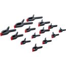 Federzwingen sind quasi kleine Klemmzwingen, die Sie mit einer Hand bedienen können. An einem Griff wie bei einer Zange zum Beispiel laufen die Spannarme in unterschiedlicher Stärke aus. Es gibt Ausführungen mit einem oder mit zwei beweglichen Spannarmen. Vor allem kleinere und empfindliche Werkstücke, Ecken und Kanten oder schwer zugängliche Bereiche können mit den praktischen Federzwingen gut erreicht und befestigt werden.